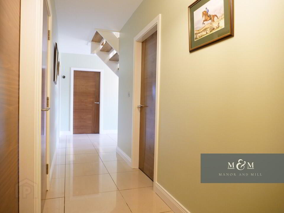 Approaching the property, impressive brick pillars and double gates open onto a sweeping gravel driveway, leading to a home framed by manicured lawns and the privacy of the surrounding countryside. On entering, you are welcomed into a bright and sophisticated hallway featuring large-format polished tiles with a decorative mosaic inlay.