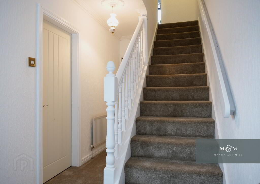 Upstairs, the first floor landing leads to three spacious bedrooms, one of which features a built-in wardrobe. All bedrooms are newly carpeted, adding to the comfort and modern finish. A family bathroom with a three-piece suite completes the first floor.