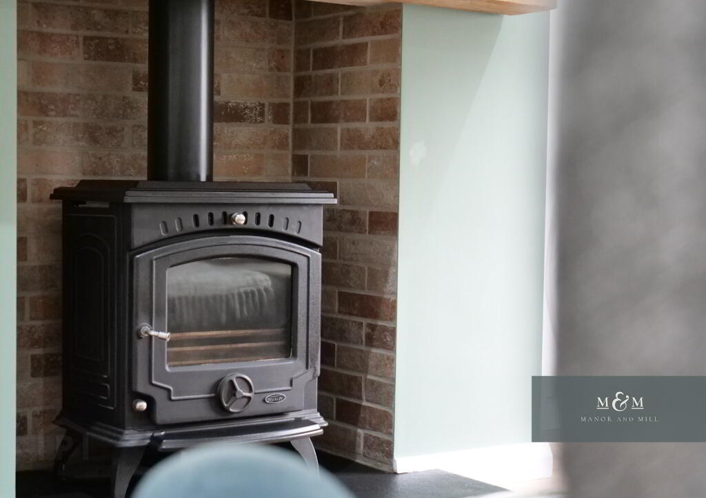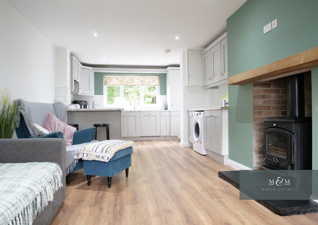 Step into the entrance hall, beautifully styled with wood effect flooring and classic wall panelling. The flooring continues seamlessly into the open-plan living and kitchen area. The living room boasts a feature wood burning stove, creating a cosy and inviting space. To the rear, the contemporary kitchen is open-plan and well equipped, with direct access to a low-maintenance paved garden, perfect for relaxing or entertaining. The ground floor also offers a fully panelled bathroom with a modern three-piece suite.
