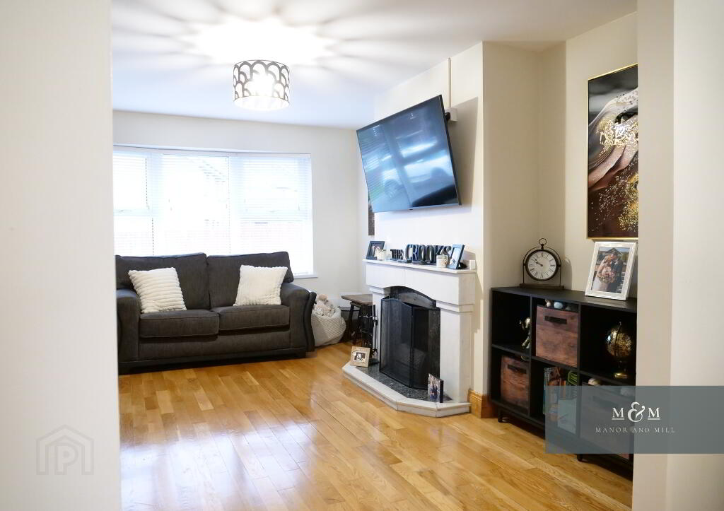 To the front of the home is a welcoming family lounge featuring an open fire and hardwood flooring, which flows seamlessly through to the second reception room to the rear. This bright and versatile space is ideal for use as a dining area, second living space, or playroom, and benefits from excellent natural light via a large aspect window, creating a superb open-feel layout perfect for both everyday living and entertaining.