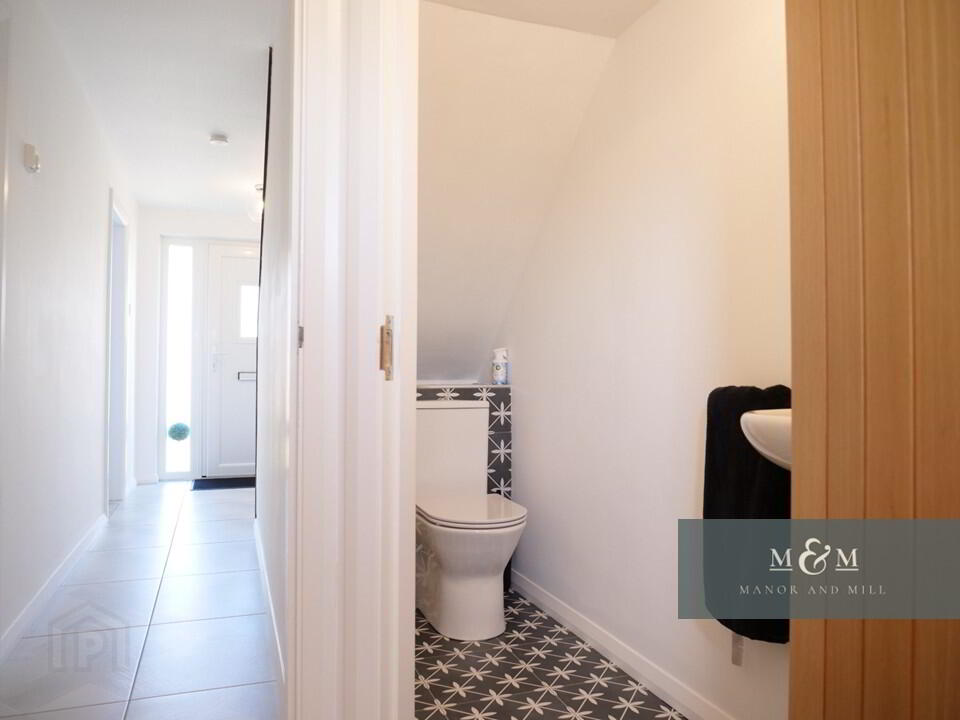 No 28 is perfectly positioned with a neat front lawn and paved pathway leading you to the front door. Step inside to a bright, welcoming hallway finished with modern oversized floor tiles that flow seamlessly throughout the ground floor. To the front of the home is a comfortable living room, boasting an open fire with a traditional wooden surround and a contemporary feature wall. To the rear, the kitchen and dining area offers a bright and practical space finished with oak style units, positioned to make the most of those rolling countryside views. Just off the kitchen, you’ll find a very handy separate utility room and a sleek, modernised downstairs W.C. finished with stylish patterned tiling.