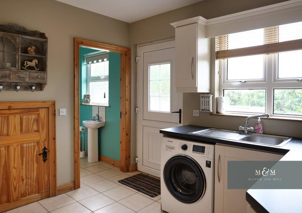Through the spacious hallway to the heart of this home. An open plan kitchen, dining and living area with wood burning stove, sliding doors to the garden and a spacious country style kitchen. A further utility room with rear access door and a w.c ensure maximum functionality for a busy household.
