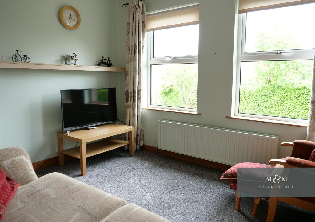 Back trough the entrance hall leading to a well appointed lounge with stained glass double entrance doors, gas fire with marble surround and windows making the most of the countryside vistas. Two double bedrooms and a four piece bathroom with jacuzzi bath are also accessed off the hallway.
